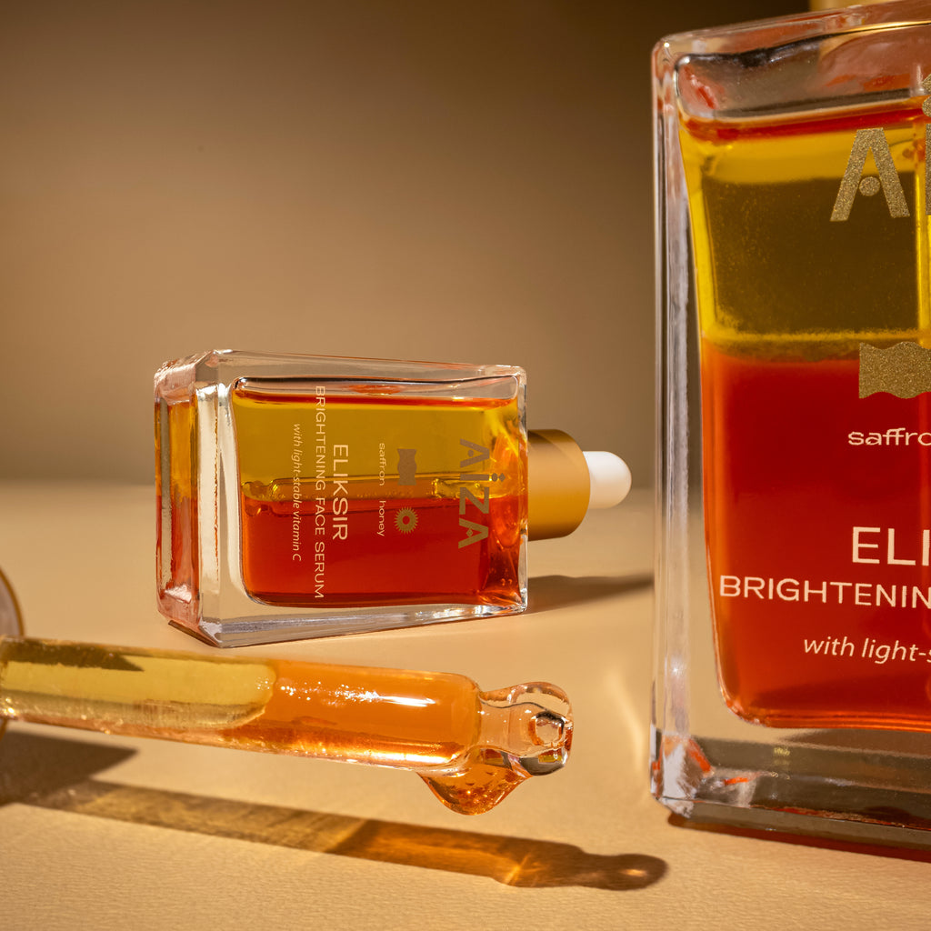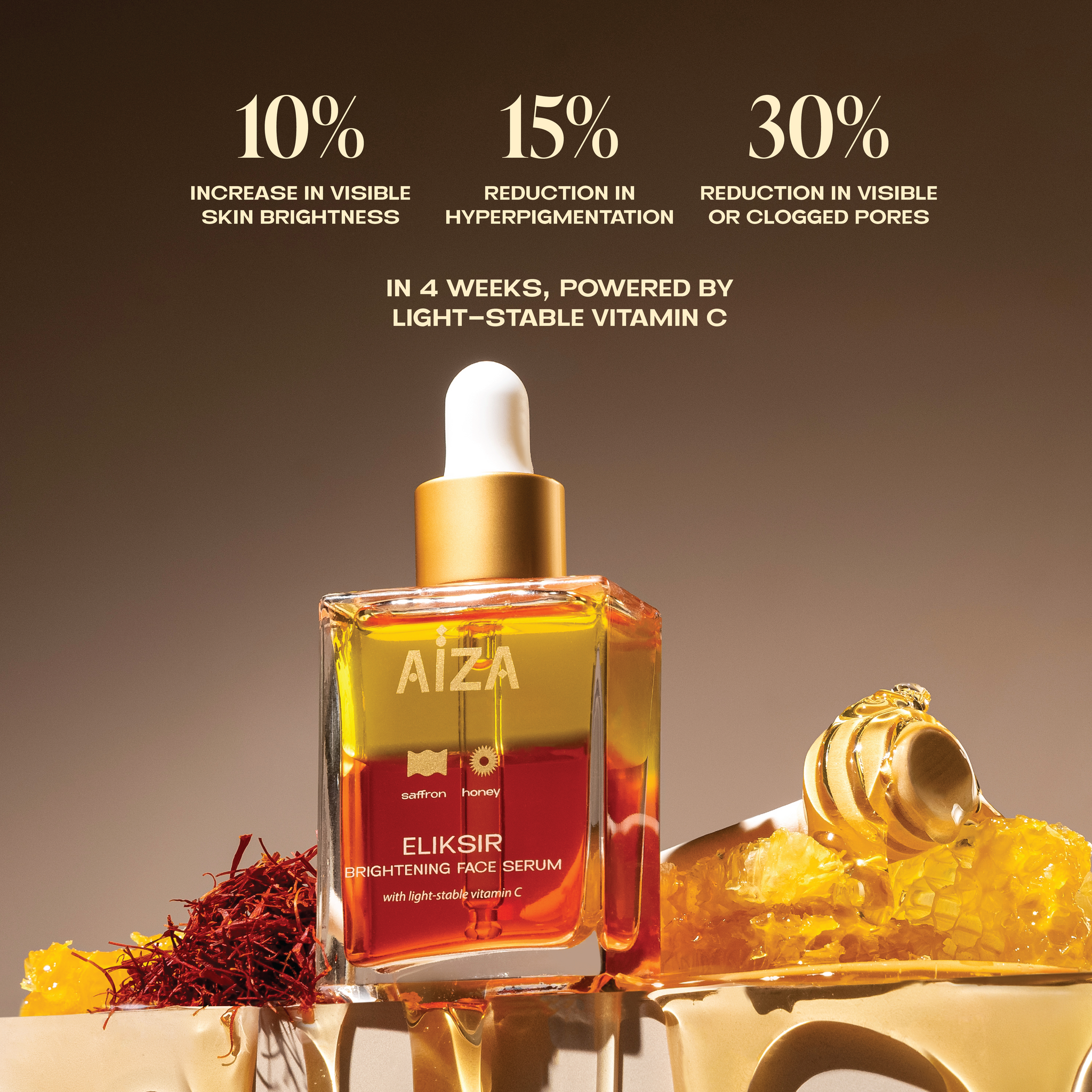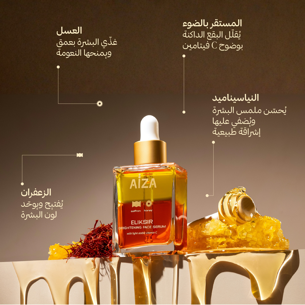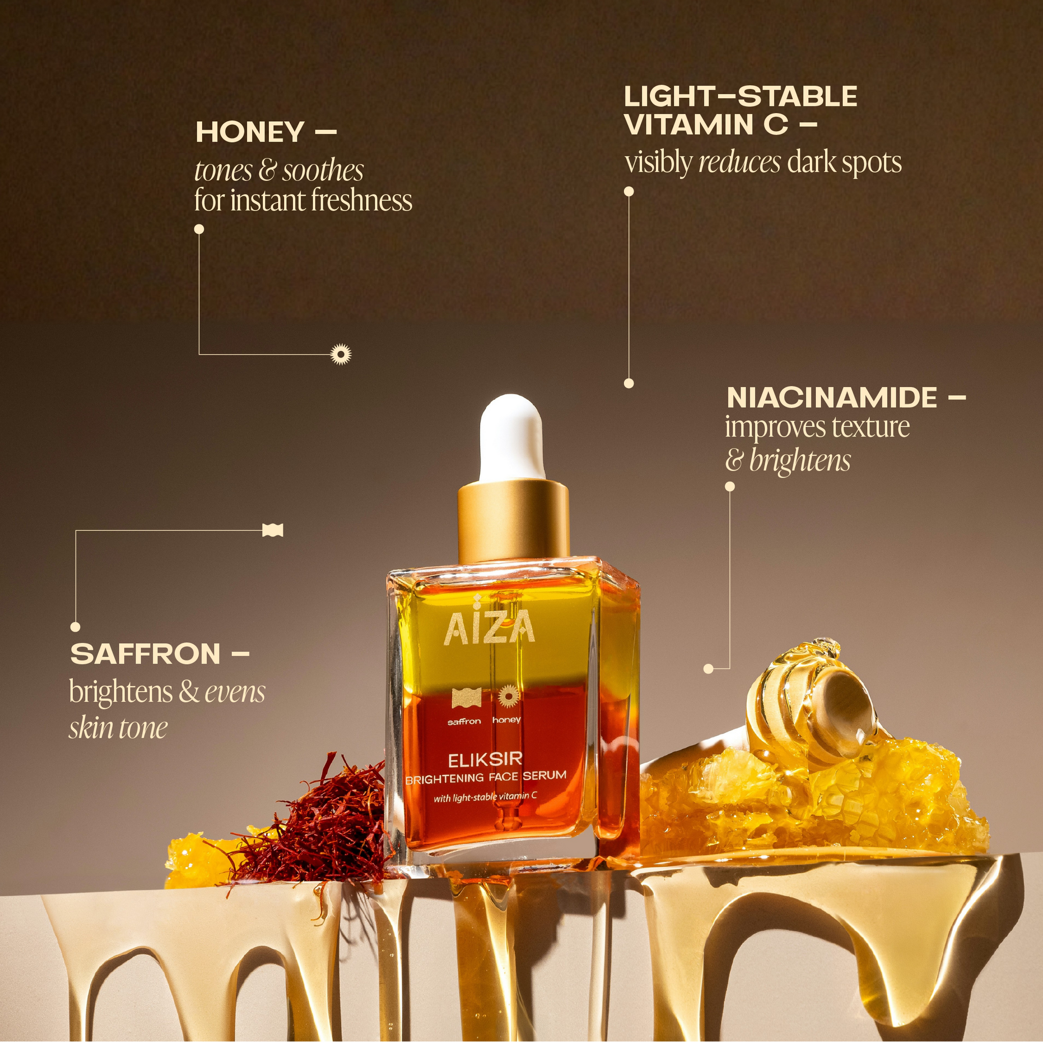 ماء، سيتيل إيثيل هيكسانوات، زيت بذور الجوجوبا، بوليديسين مهدرج، 1,2-هكسانيدول، سكوالان، زيت الأفوكادو، نياسيناميد، مستخلص العسل، خلاصة زهور الزعفران، أسكوربيل تيترات إيزوبالمتيت، خلاصة الرمان، بيوتيلين غليكول، خلاصة الجزر، زيت بذور الجزر، خلاصة التمر، أدينوزين، صمغ السليلوز، كلوريد الصوديوم، زيت الكانولا، إيثيل هيكسيليجليسرين، زيت بذور دوار الشمس، جلوتاثيون، حمض الستريك، توكوفيرول، خلاصة العرعر، خلاصة نبق البحر، سترات الصوديوم، مستخلص اللبان المر، بيتا كاروتين، توكوفيريل أسيتات، سيانوكوبالامين، فتيت الصوديوم، أصفر 6 (CI 15985)، أحمر 33 (CI 17200)، عطر.