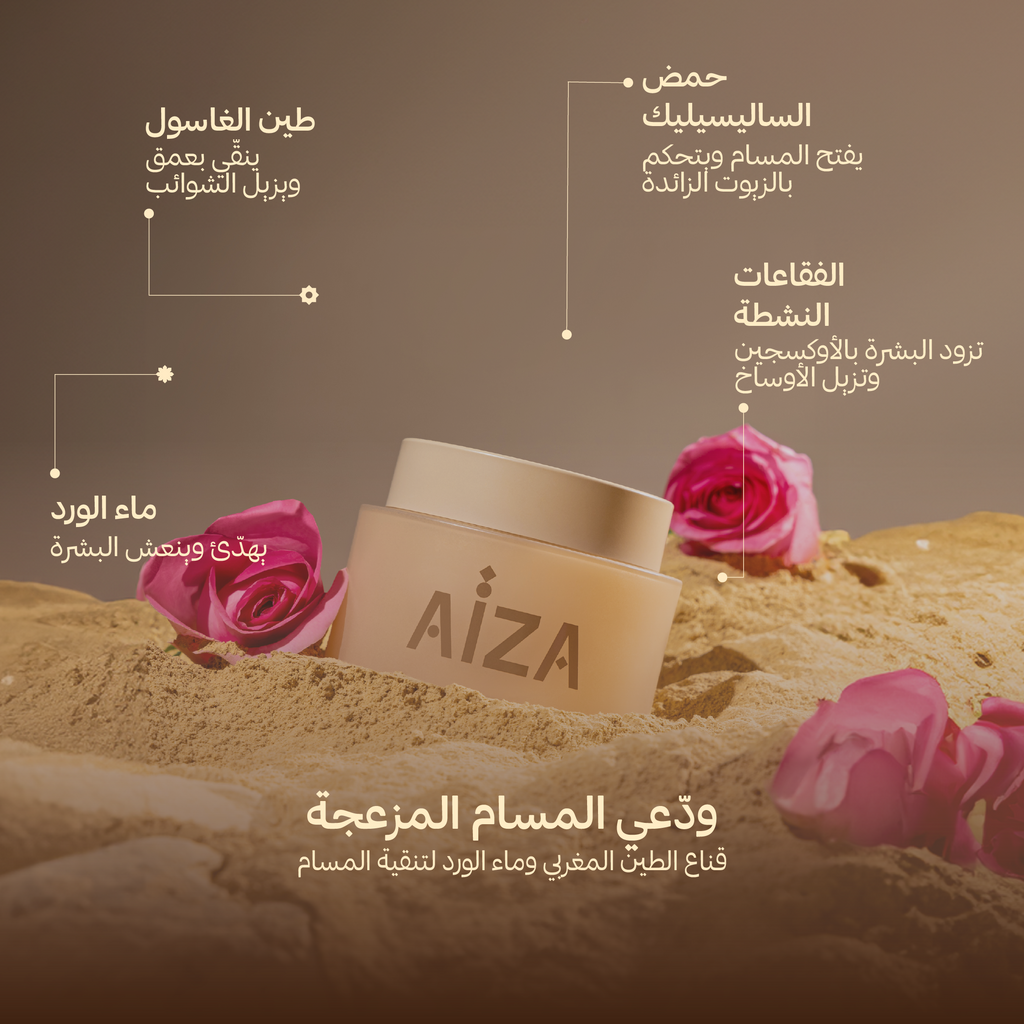 ماء، بنتونيت، كاولين، غليسيرين، طمي الغاسول، ميثيل بيرفلوروأيزوبيوتيل إيثير، ميثيل بيرفلوروبوتيل إيثير، ديسيل غلوكوسيد، ديبروبيلين غليكول، بيوتيلين غليكول، ثنائي الميثيكون، كوكاميدوبروبيل بيتاين، ماء الورد الجوري، حمض الساليسيليك، بولي أكريلات الصوديوم، إيثيل هكسيل ستيرات، كلوريد الصوديوم، صمغ الزانثان، ترايديسيث-6، C11-13 إيزوألكان، فتيت الصوديوم، 1,2-هكسانيدول، فينوكسي إيثانول، عطر.